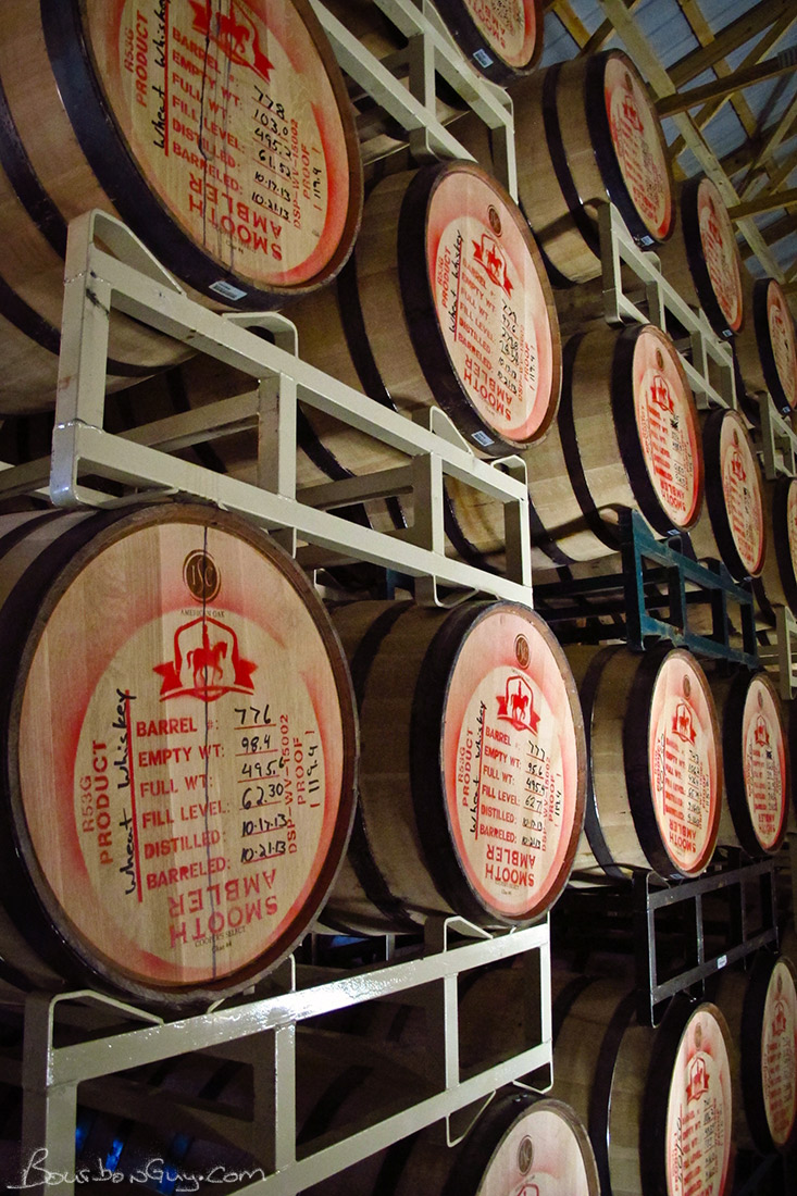 Bourbon barrels filled just a day or so before we visited. This is either the start of a new set of racks or they are waiting to be put somewhere. Most of the stacks were twice this high.